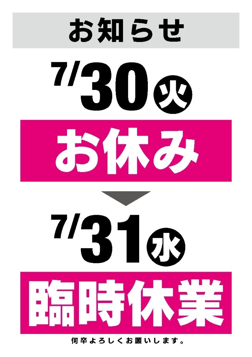 7/31(水)は棚卸しのため、臨時休業いたします。
